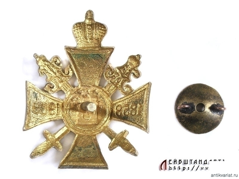 Памятный знак в память покорения Восточного Кавказа в отличном состоянии. Представляет собой Кавказский крест, в центре которого помещена римская цифра "L" - "50". На горизонтальных лопастях креста помещены даты юбилея: 1859 - 1909. На концах клинков мечей - вензеля Императоров Александра II и Николая II. Знак бронзовый, контррельефный, практически полностью сохранилось оригинальное золочение. На винте, в комплекте с закруткой.