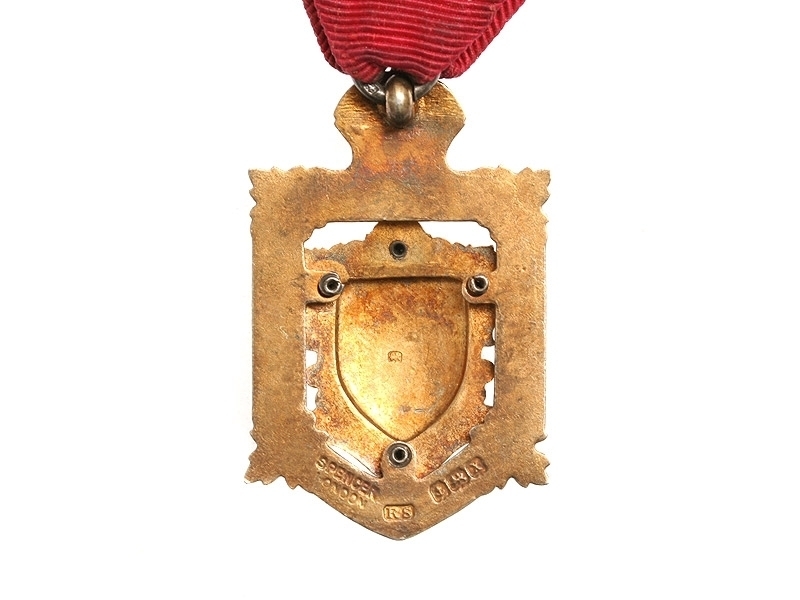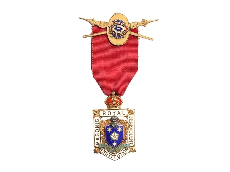 Знак выпускника Королевского масонского благотворительного института на оригинальной колодке. 1920-е - 1930-е годы. Серебро, золочение, эмаль. Хорошее состояние, незначительный чешуйчатый скол эмали.