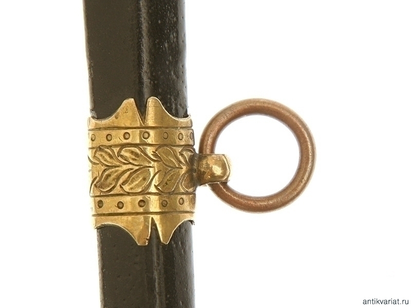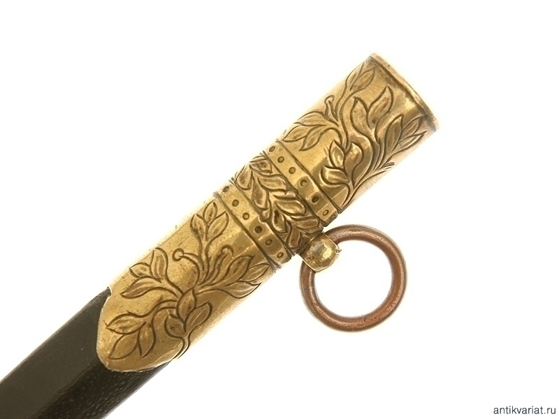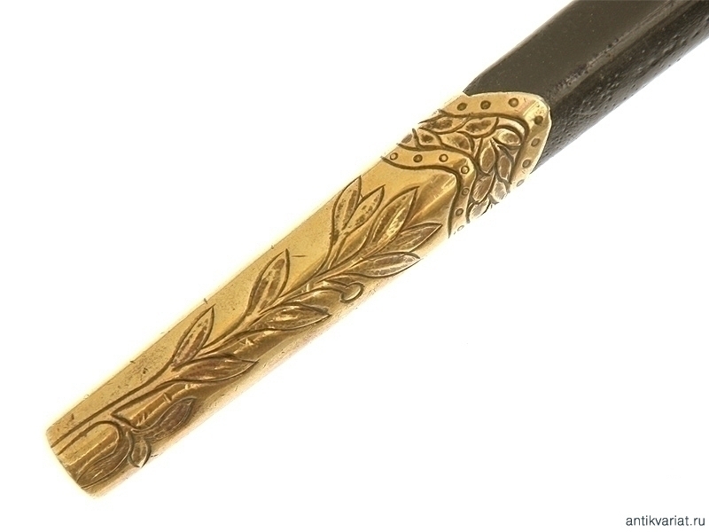 Ножны деревянные оклеены кожей, вставки ножен украшены чеканными и гравированными изображениями лавровых листьев.