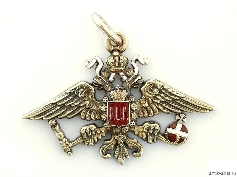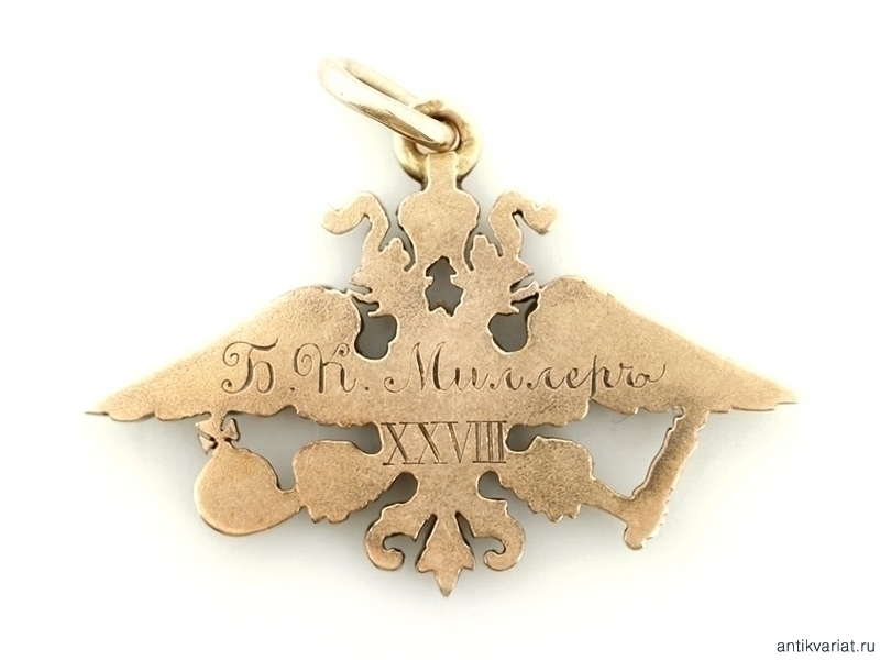 Жетон об окончании Университетских курсов Императорского Лицея Цесаревича Николая в Москве - ранний вариант, бытовавший до утверждения нового знака (знак нового образца был утвержден 6 июля 1907 года). Изготовлен из золота 56 пробы в виде двуглавого орла, корона, ленты и держава которого покрыты эмалью. На груди расположен накладной эмалевый щиток с монограммой "Н.Ц.Н." - Наследник Цесаревич Николай. Оборотная сторона гладкая с гравировкой - фамилия владельца "Б.К.Миллеръ" и выпуск, обозначенный римскими цифрами "XXVIII".