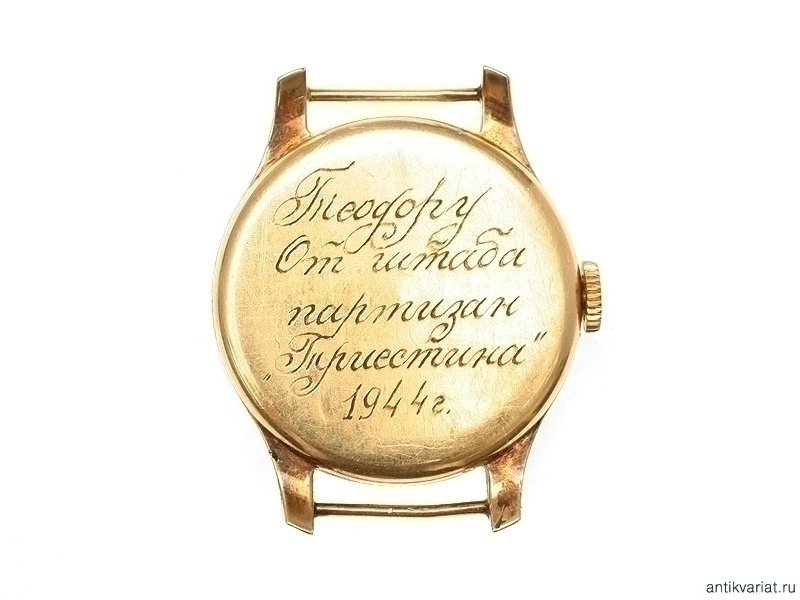 Наручные часы в корпусе из золота 750-й пробы, изготовленные швейцарской фирмой "Longines". На ходу, очень хорошее состояние. На крышке часов - гравированная надпись "Теодору от штаба партизан "Триестина", 1944 год.