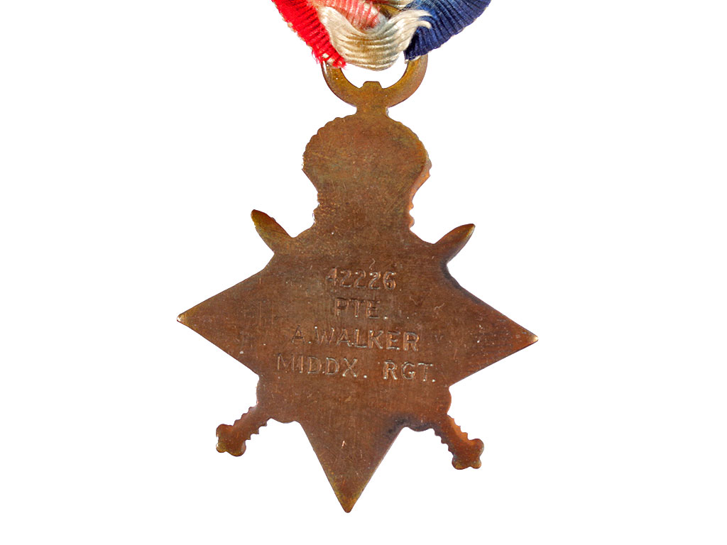 Звезда 1914 - 1915 годов. Бронза, хорошее состояние. С именной гравировкой на реверсе "42226 PTE. A.WALKER MIDDX. RGT.".