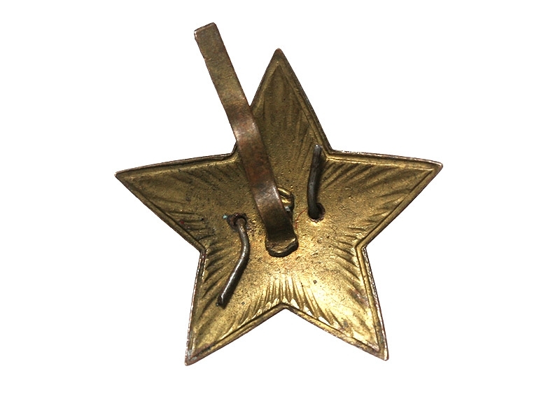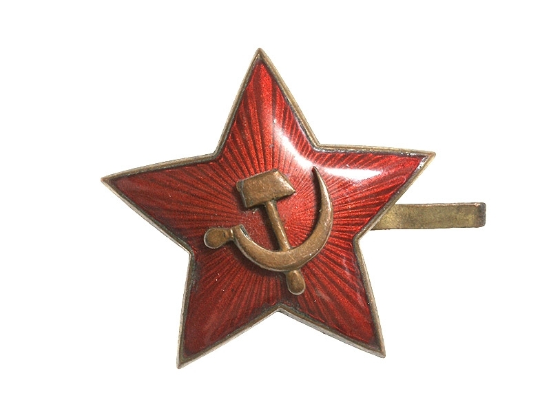 Эмалевая звезда на фуражку РККА периода Второй мировой войны с накладным серпом и молотом. Один крепежный ус отсутствует.