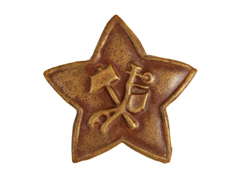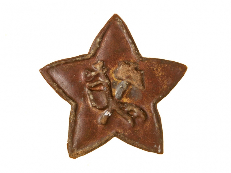 Ранняя звездочка красноармейца РККА с изображением скрещенных плуга и молота. Латунь, красное красочное покрытие не сохранилось, крепежные "усы" отсутствуют.