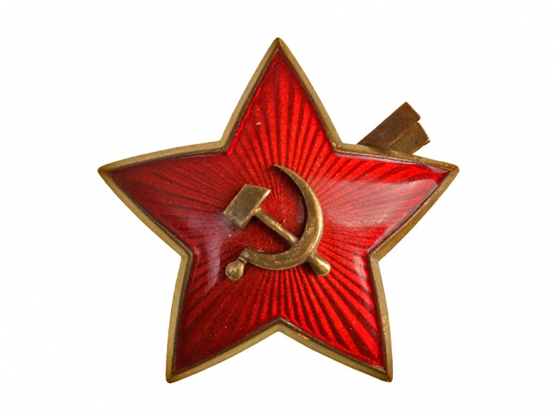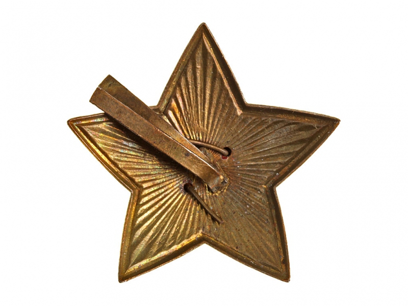 Оригинальная командирская звездочка РККА на головной убор образца 1936 года. Омедненное железо, эмаль, с накладным серпом и молотом и железными же омедненными усами для крепления. Отличное состояние.