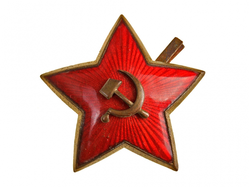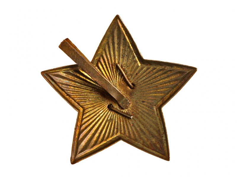 Оригинальная командирская звездочка РККА на головной убор образца 1936 года. Омедненное железо, эмаль, с накладным серпом и молотом и железными же омедненными усами для крепления. Отличное состояние.