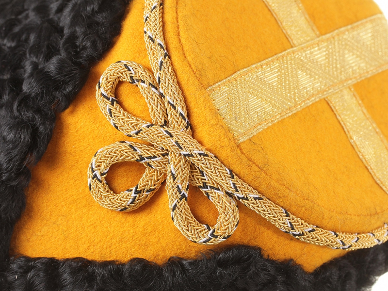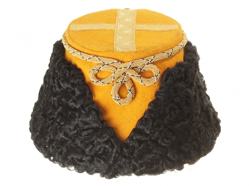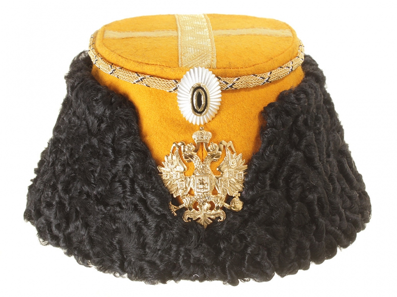 Натуральный каракулевый мех, подбита натуральной кожей, подкладка из муара, в комплекте: государственный герб желтый латунный и кокарда малая образца 1881 года.