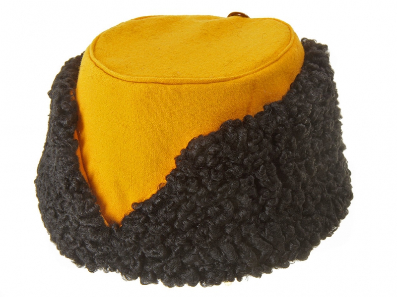 Натуральный каракулевый мех, подбита натуральной кожей, в комплекте: государственный герб желтый латунный и кокарда малая образца 1881 года.