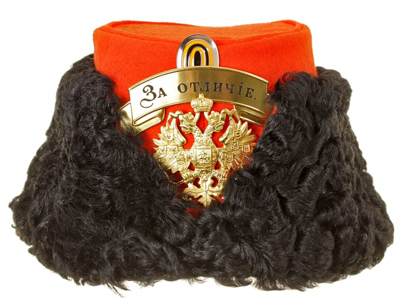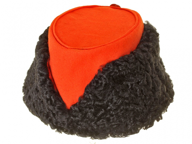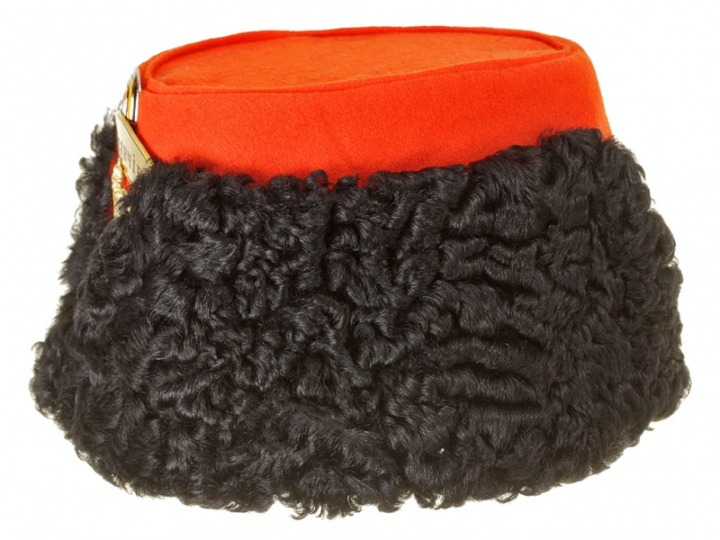 Натуральный каракулевый мех, подбита натуральной кожей, в комплекте: государственный герб желтый латунный и кокарда малая образца 1881 года.