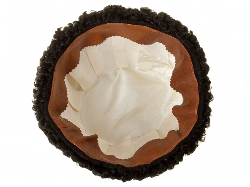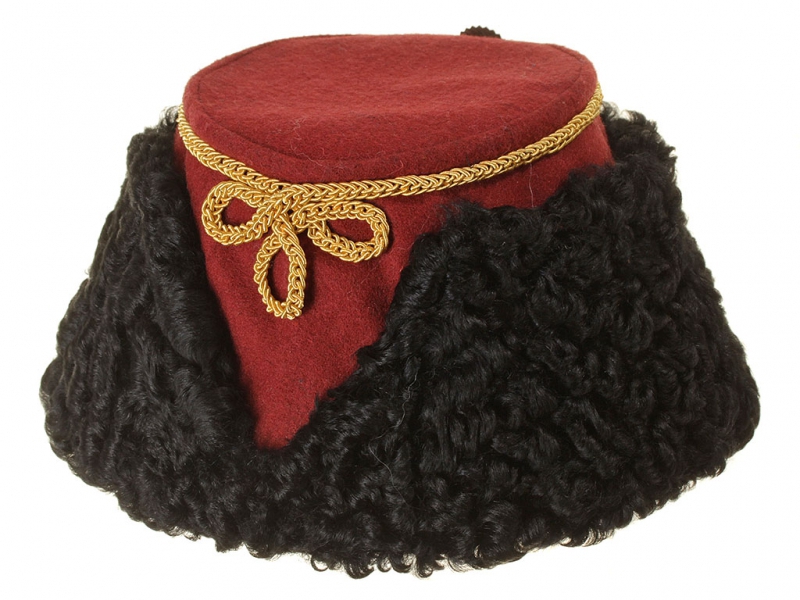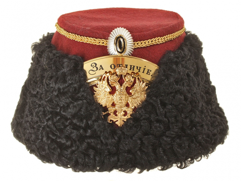 Натуральный каракулевый мех, подбита натуральной кожей, подкладка из муара, в комплекте: государственный герб желтый латунный и кокарда малая образца 1881 года.
