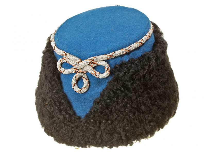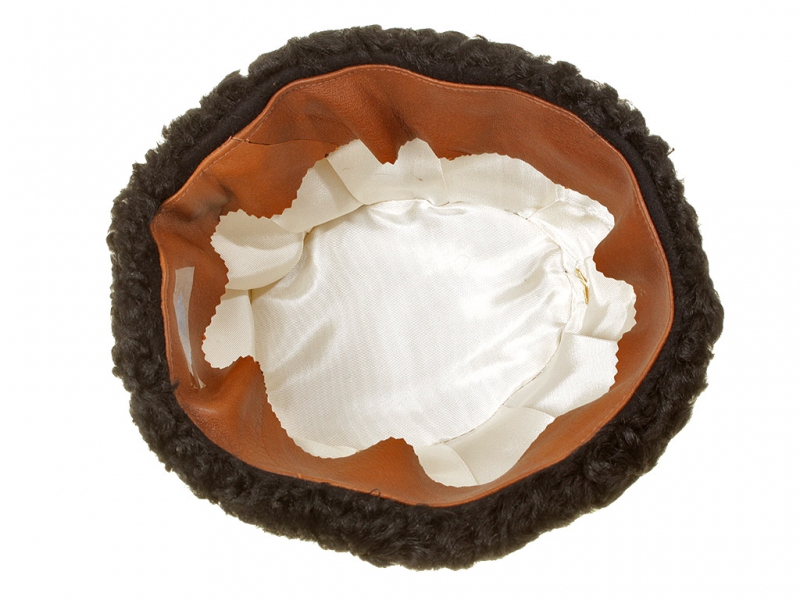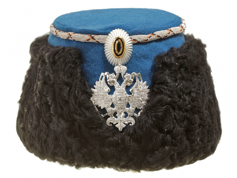Натуральный каракулевый мех, подбита натуральной кожей, подкладка из муара, в комплекте: государственный герб белый латунный и кокарда малая образца 1881 года.