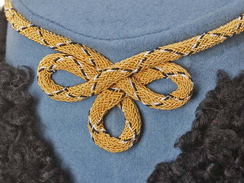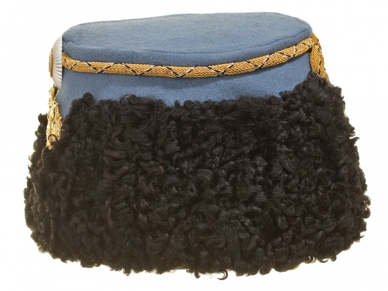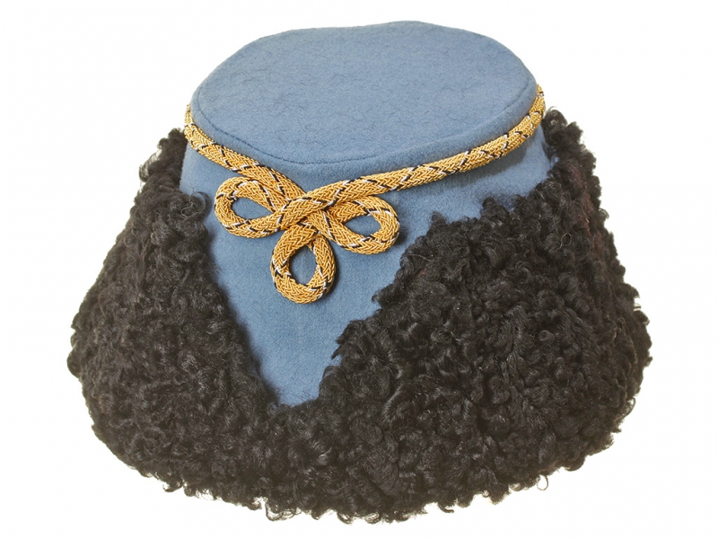 Натуральный каракулевый мех, подбита натуральной кожей, подкладка из муара, в комплекте: государственный герб желтый латунный и кокарда малая образца 1881 года.
