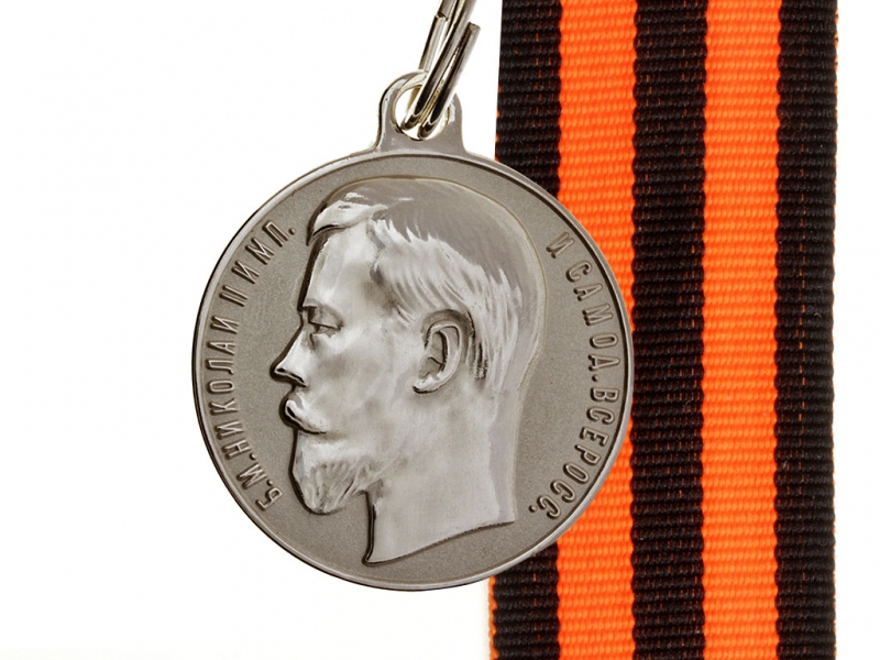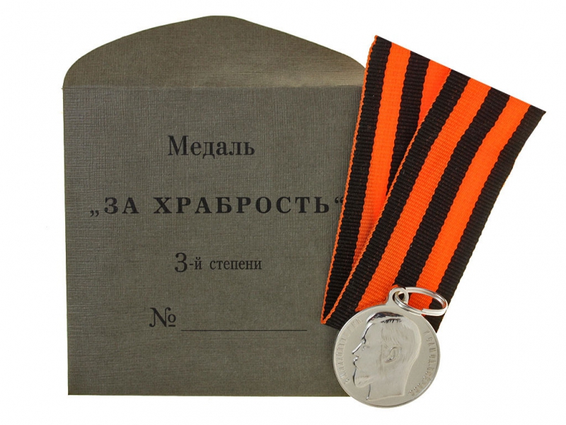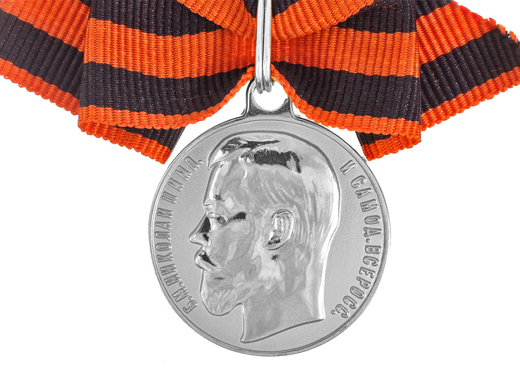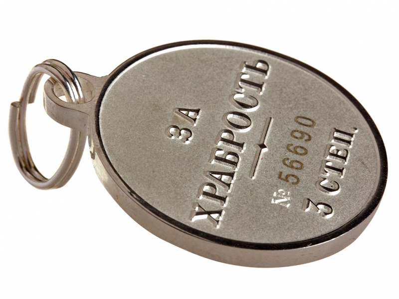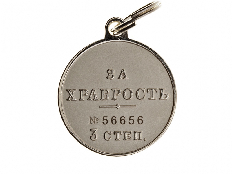 Георгиевская серебряная медаль «За храбрость» 3-й ст. От 4-й степени отличается наличием банта на колодке (также степень медали указана на реверсе).