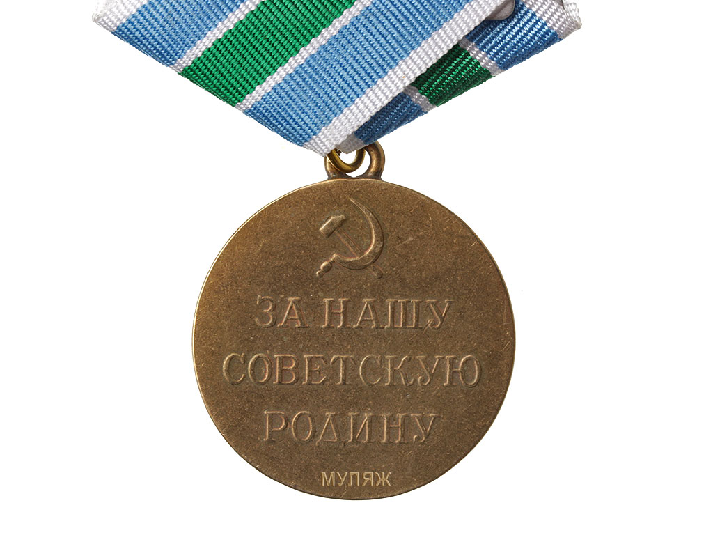 Медаль при помощи ушка и кольца соединяется с пятиугольной колодочкой, обтянутой шелковой муаровой лентой голубого цвета шириной 24 мм. Посередине ленты зеленая полоска шириной 6 мм. Края ленты и зеленой полоски окаймлены узкими белыми полосками.