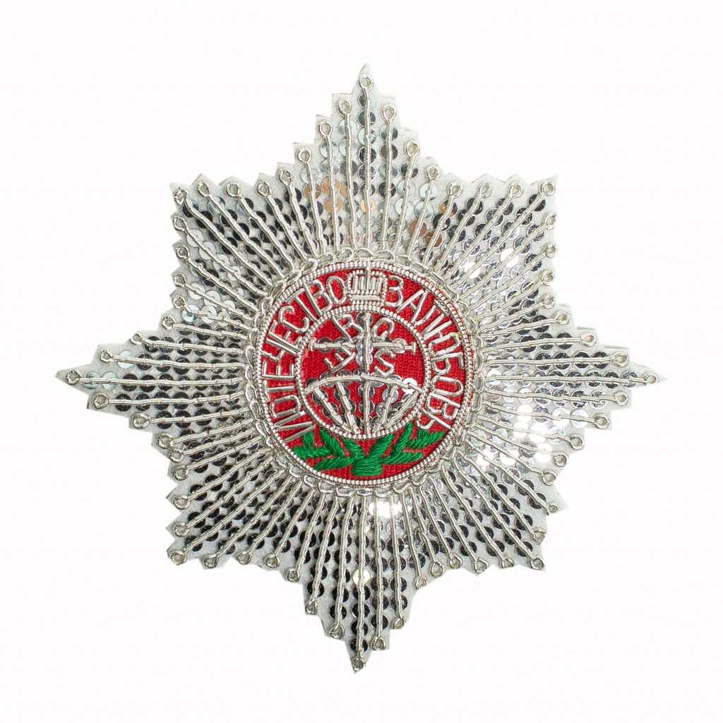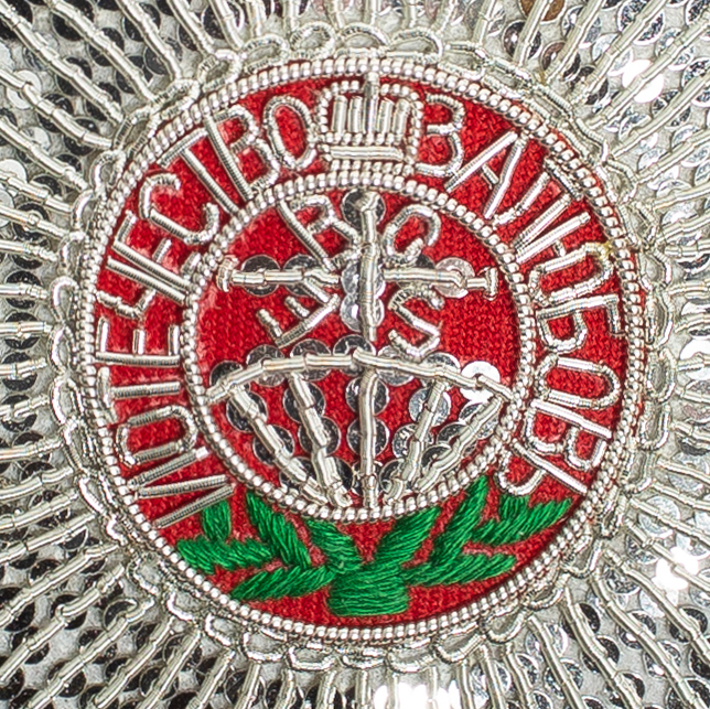 В центральном медальоне звезды вышит серебряной канителью по медальону красного шелка Крест и Девиз: «ЗА ЛЮБОВЬ И ОТЕЧЕСТВО». Размер - 90x90 мм.