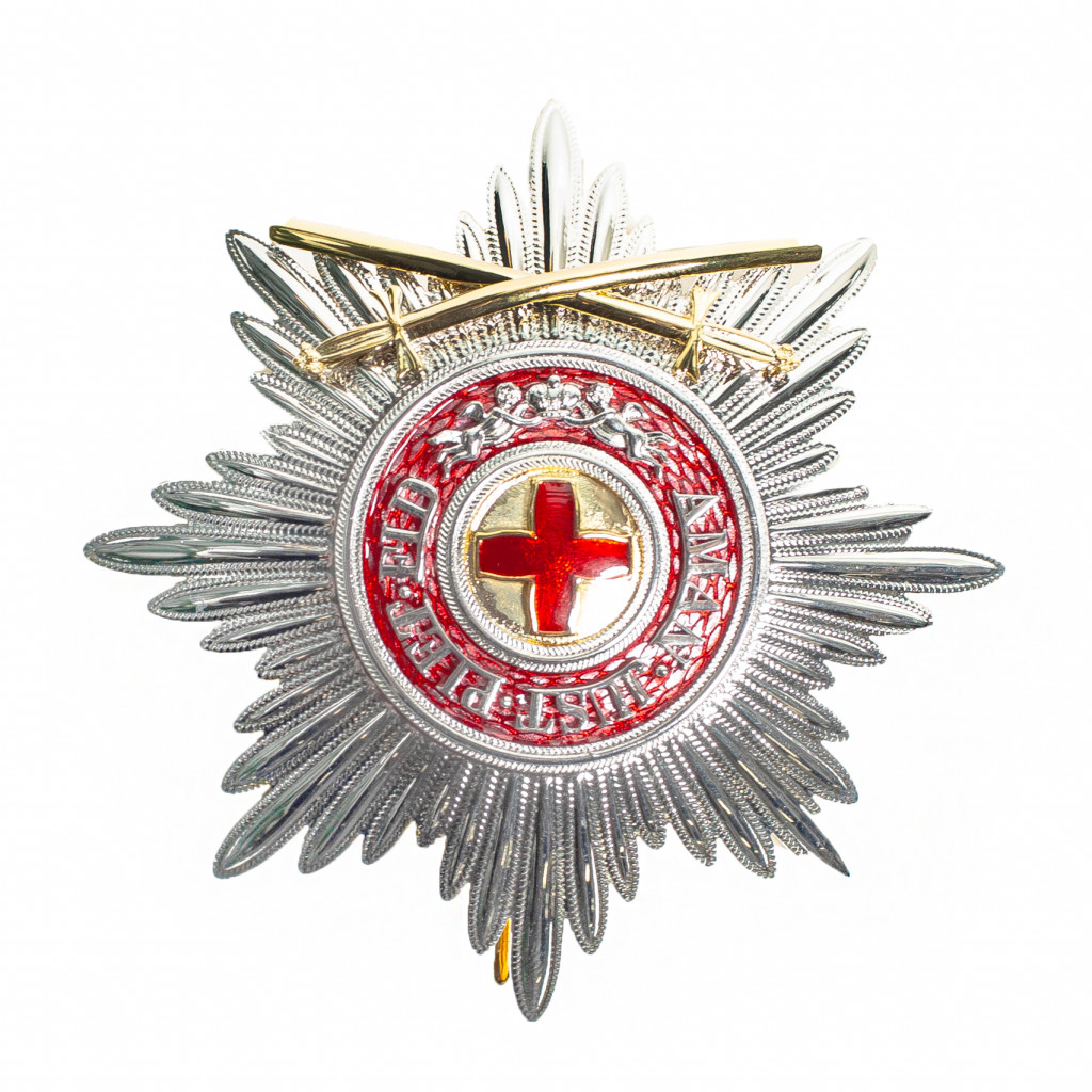 Согласно высочайшему указу от 5 августа 1855 года, если награжденный уже имел орден за военный подвиг, но низшей степени, то на ордене, которым его жаловали за другие отличия, должны быть мечи на верхнем луче креста и на верхнем луче звезд. Всем кавалерам, получившим ордена за военные подвиги, равно как и тем, кто за военные заслуги имел ордена низших степеней, а впоследствии за другие отличия получил ордена высших степеней до указа от 5 августа 1855 года, было предоставлено право к имевшимся у них орденам присоединять мечи наверху креста и звезды.