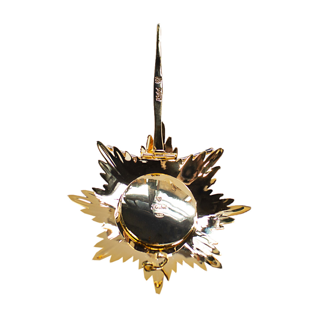 Копия Звезды ордена Святой Анны первой степени с мечами изготовлена из металла, серебрение, золочение, цветная эмаль, монтировка. Размер — 90x90 мм. Копия высокого качества.