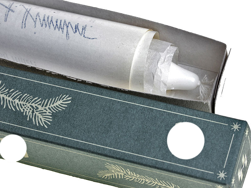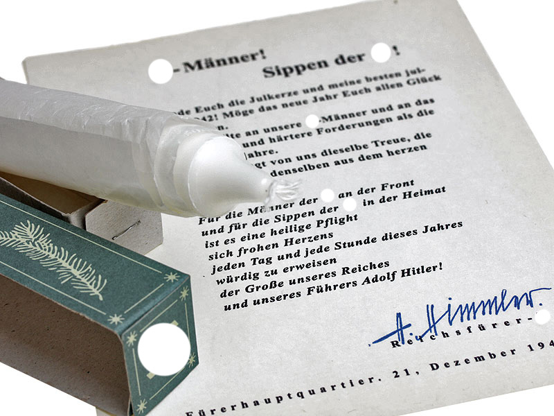 Копия отличного качества исключительно редкого предмета, известного всем интересующимся историей Третьего рейха и Альгемайне-СС (Allgemeine SS): йольской свечи. На сегодняшний день известно около десятка сохранившихся оригинальных экземпляров. Свеча помещена в картонную коробку, украшенную изображениями еловых лапок и рун SS. На бумаге достоверно воспроизведен текст сопроводительного письма с факсимиле подписи Гиммлера: