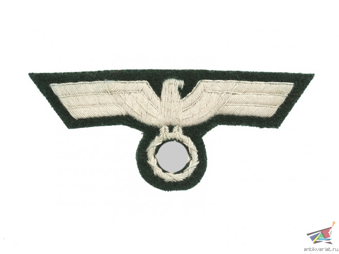 Нагрудный нашивной знак в виде орла на униформу образца 1936 года (М 36) рядового состава Вермахта. Вышивка шелковой нитью на темно-зеленой суконной основе.