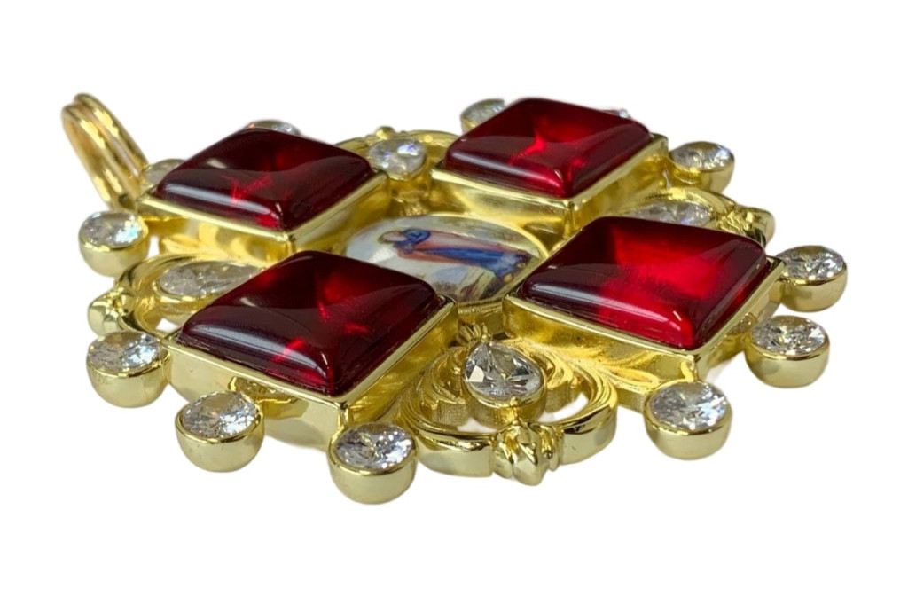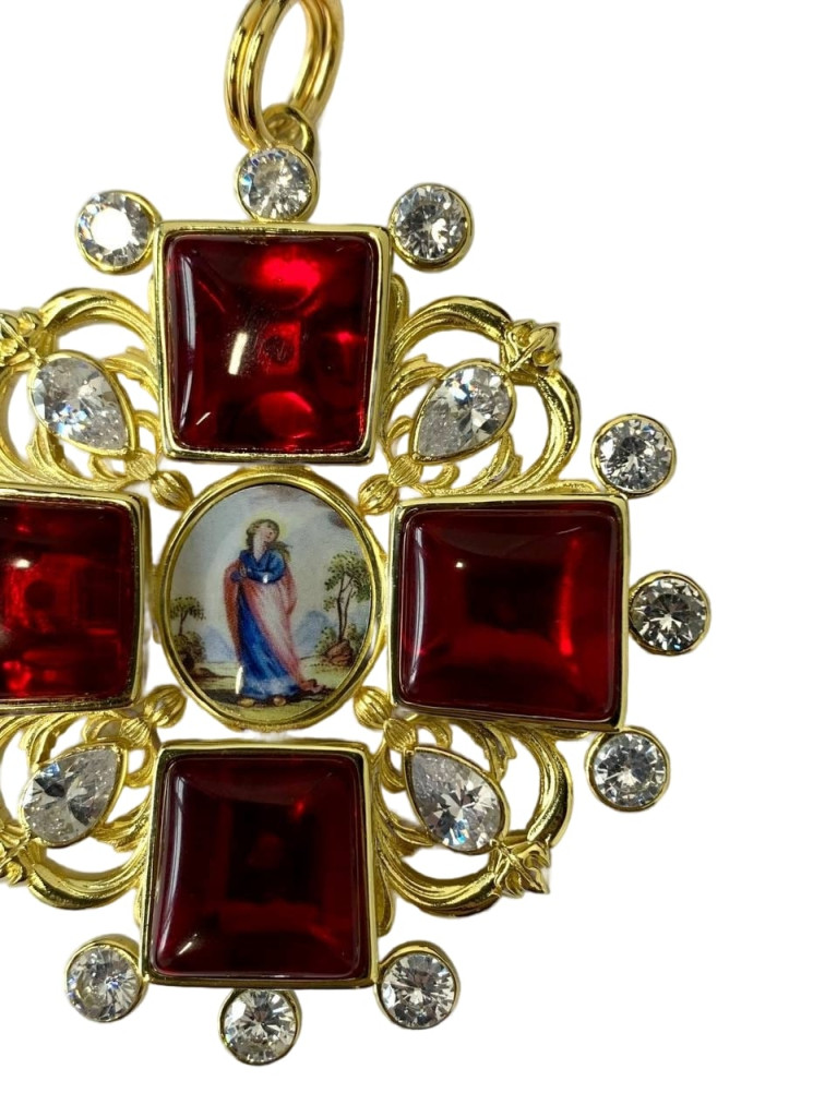 Высококачественная копия знака (крест 2-го типа) ордена Святой Анны первого класса, украшенного алмазами/бриллиантами, периода конца XVIII – начала ХIХ веков. Размер 75 на 80 мм (с ушком), вес с промзвеном около 87 грамм, изготовлен из ювелирного сплава, выполнено золочение и серебрение (оправа камней), имитация двенадцати бриллиантов округлой (диаметр 5 мм) и четырех каплевидной «груша» (6 х 10 мм) формы из белого стекла, все четыре луча креста выполнены с использованием красного полированного стекла. Центральный медальон аверса и реверса выполнен финифтью. Носился знак в узле орденской шелковой муаровой ленты, шириной 100 мм через левое плечо совместно со звездой ордена, носимой на правой стороне мундира.