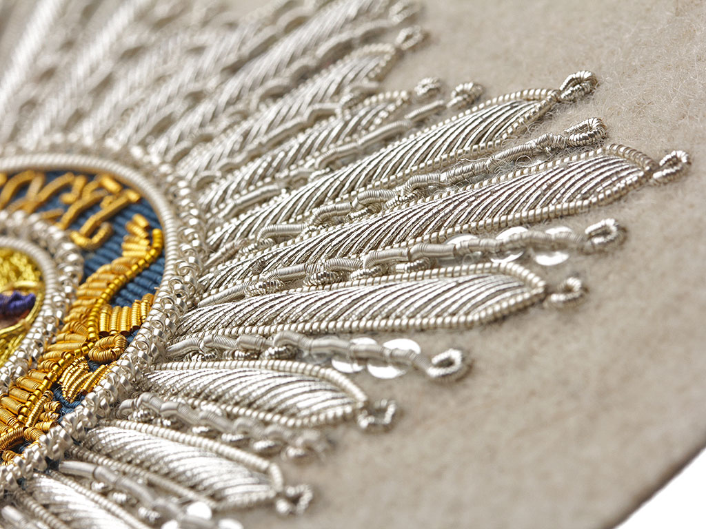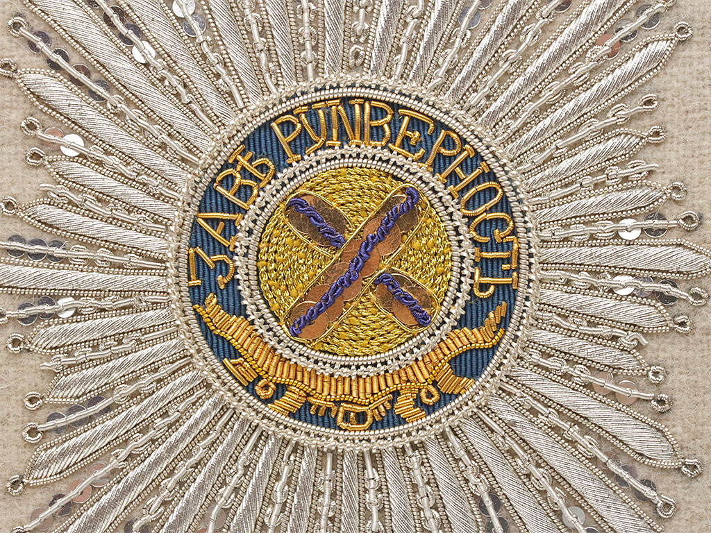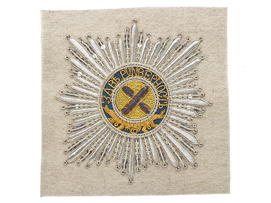 Шитая звезда ордена Святого Андрея Первозванного. За образец при изготовлении копии взята подлинная звезда XIX века. Звезды всех российских орденов в XVIII - XIX веках зачастую были шитыми - они служили для повседневного ношения на мундире.