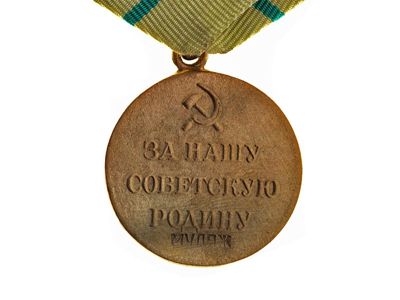 На оборотной стороне медали надпись «ЗА НАШУ СОВЕТСКУЮ РОДИНУ». Над надписью изображены серп и молот.