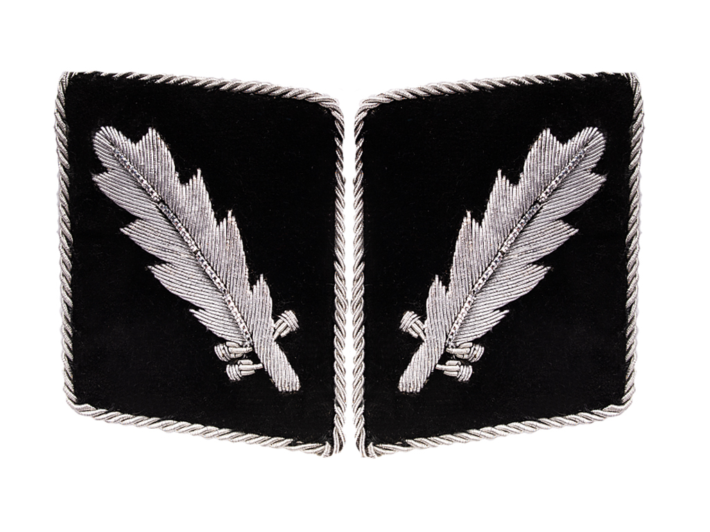 Идеально точные копии петличных знаков различия, размещаемых на вороте униформы военнослужащих Waffen-SS и Allgemeine-SS, SD. Звание Штандартенфюрер (нем. Standartenführer ) СС. Пара петличных знаков выполнена в виде зеркальных параллелепипедов из черного бархата, обшитого по периметру серебряным шнуром с вышитой вручную серебристой канителью. На обеих петлицах символы, соответствующие званию: дубовая ветвь с жёлудем внизу.
