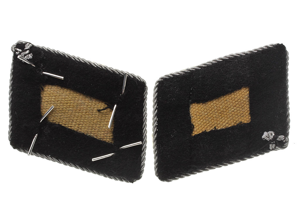 Пара петлиц оберштурмбаннфюрера СС - полностью комплектные, с установленными на них знаками различия (сдвоенной металлизированной полоски и четырех ромбов, или звезд), установленных по углам. Копия хорошего качества, вышивка металлизированной нитью.
