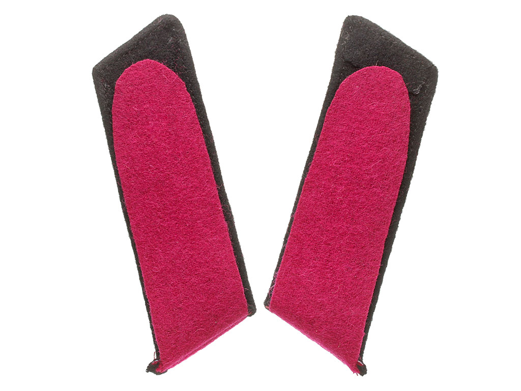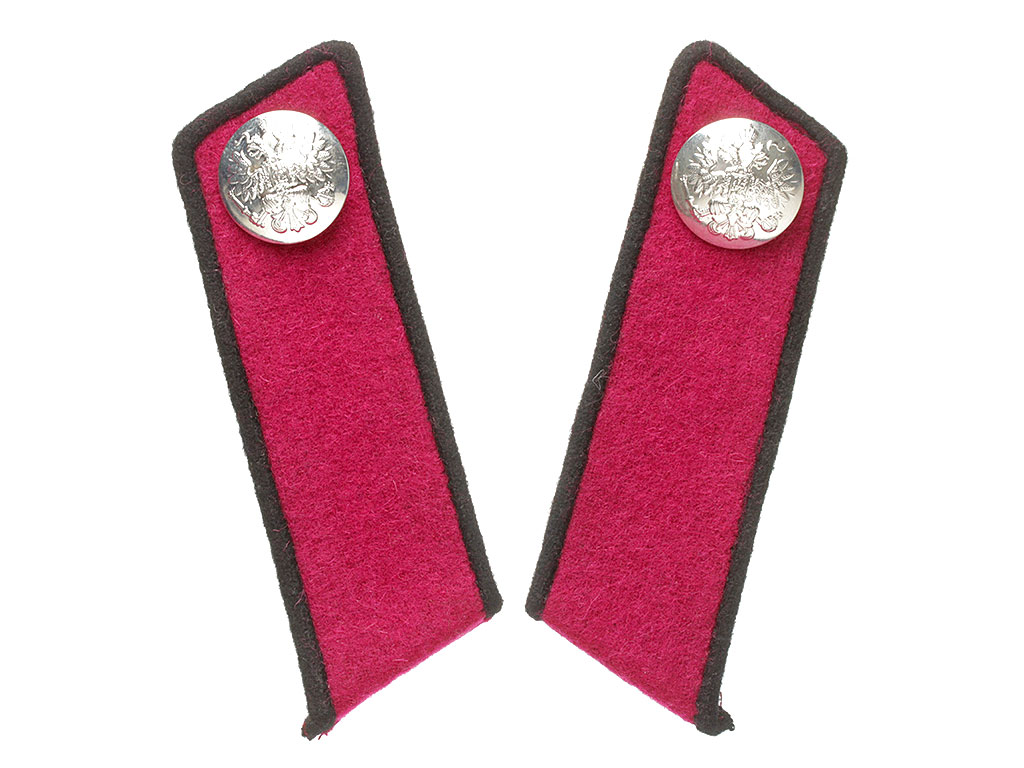Качественная копия петлиц на шинель офицера, причисленного к военно-судебному ведомству. Малиновое суконное поле, черный кант, посеребренные пуговицы с изображением Государственного герба.