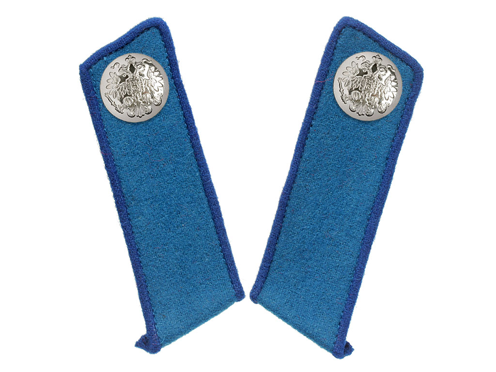 Качественная копия петлиц на шинель унтер-офицера 14-го уланского полка. Светло-синее суконное поле, темно-синий кант, белые пуговицы с изображением Государственного герба.