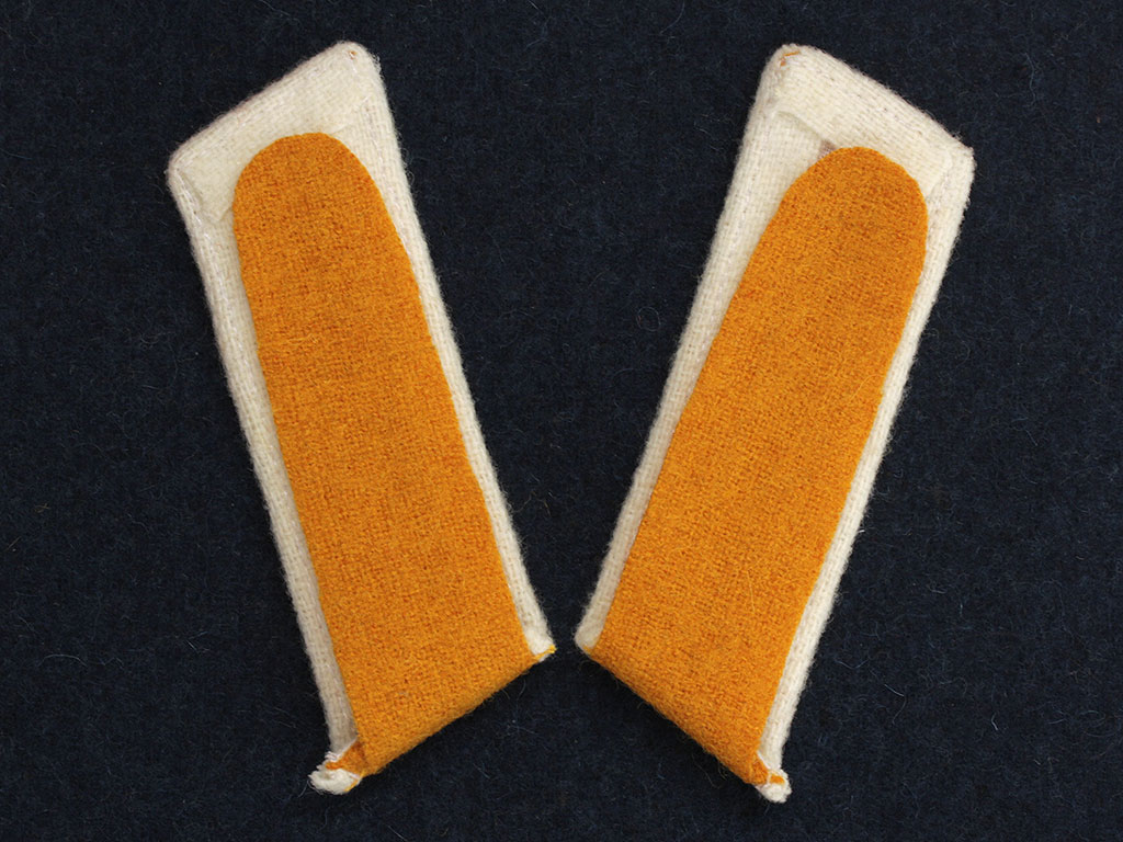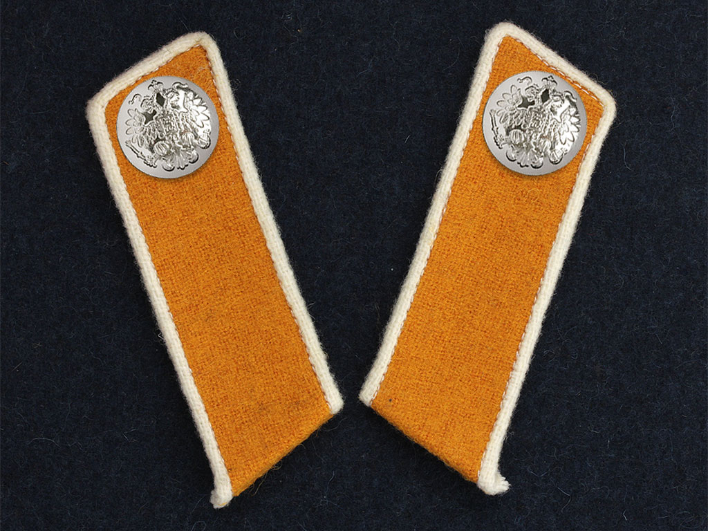 Качественная копия петлиц на шинель унтер-офицера 8-го драгунского Астраханского полка. Желтое суконное поле, белый кант, белые пуговицы с изображением Государственного герба.