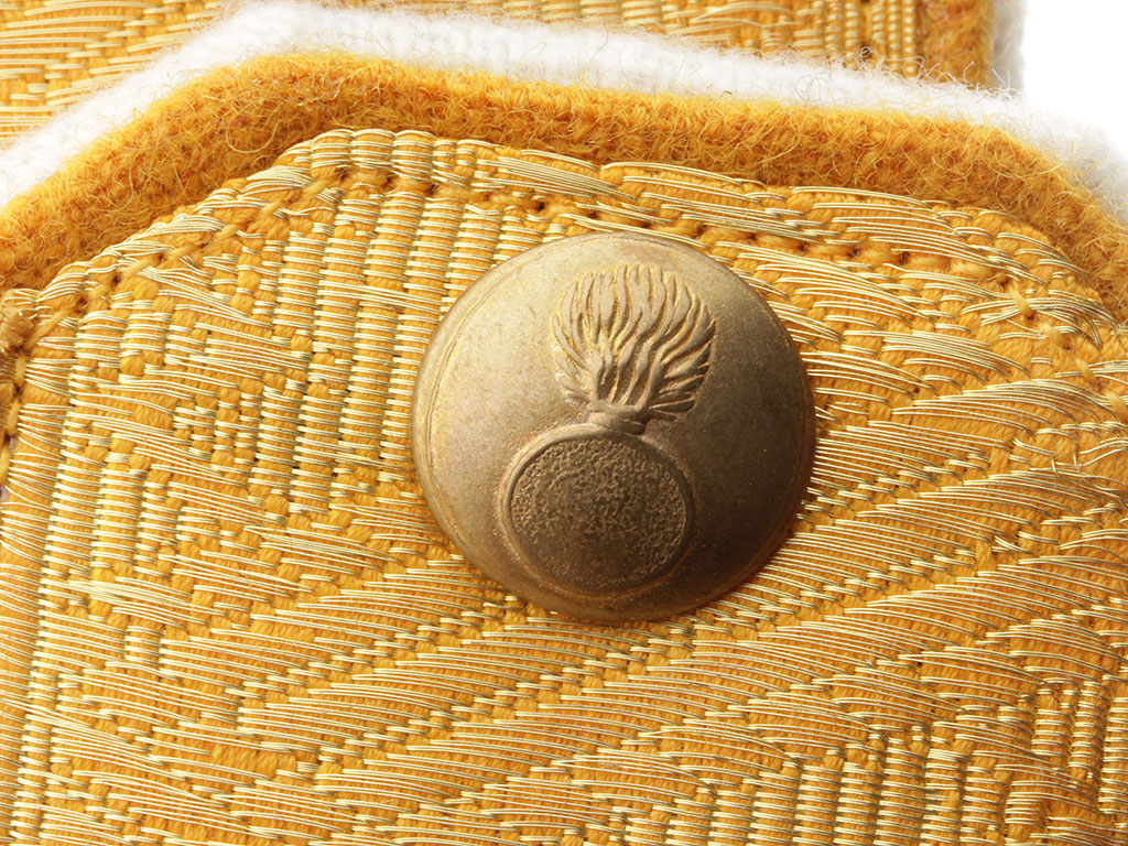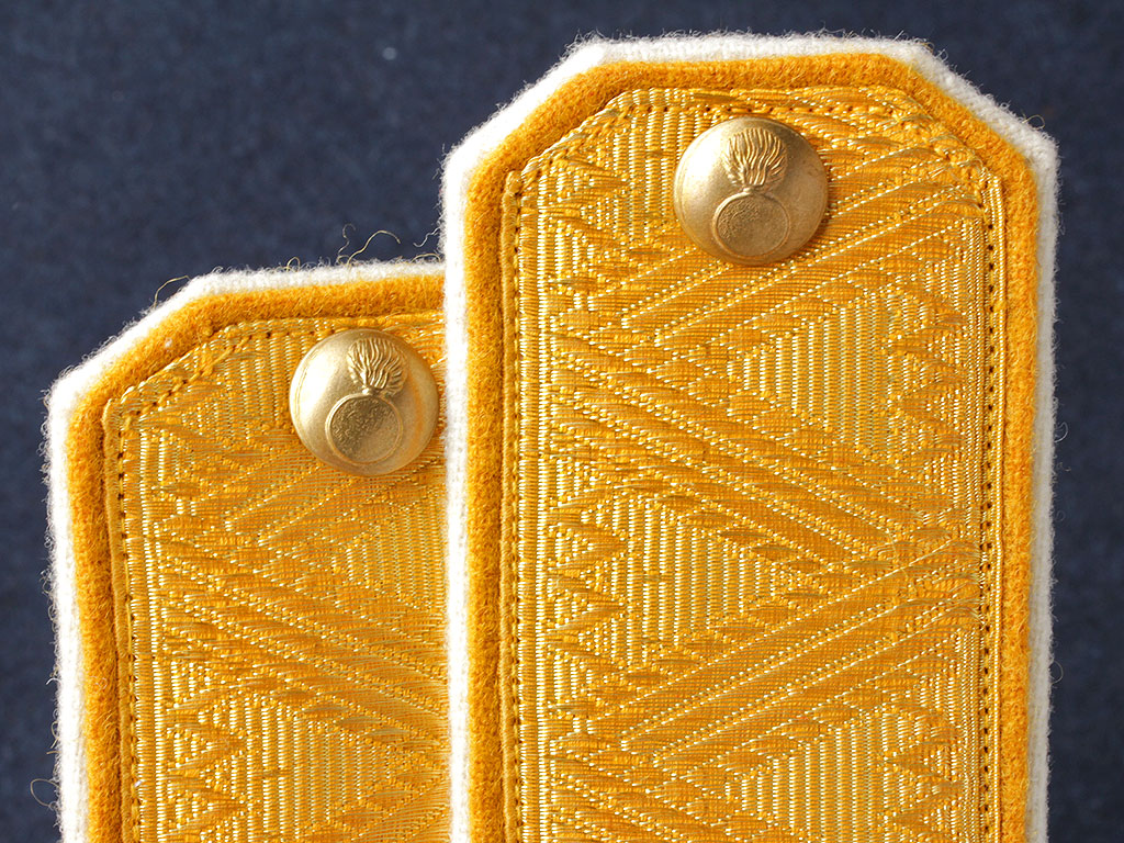 Погоны генеральские для ношения при форме 12-го гренадерского Астраханского Императора Александра III полка. Желтое металлизированное золотое поле с зигзагообразной генеральской вышивкой, двойным желтым и белым подбоем, латунные пуговицы с изображением пылающей гренады.