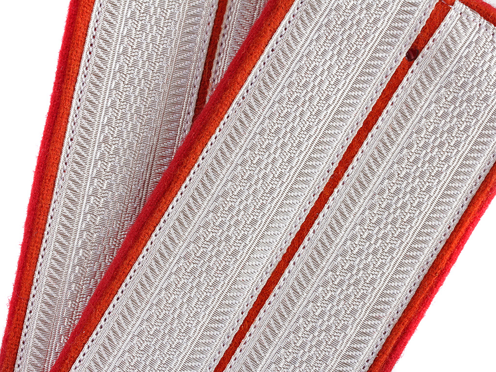 Копия высокого качества. Белое металлизированное поле, оранжевый просвет, алая основа, двойной кант - алый и оранжевый.