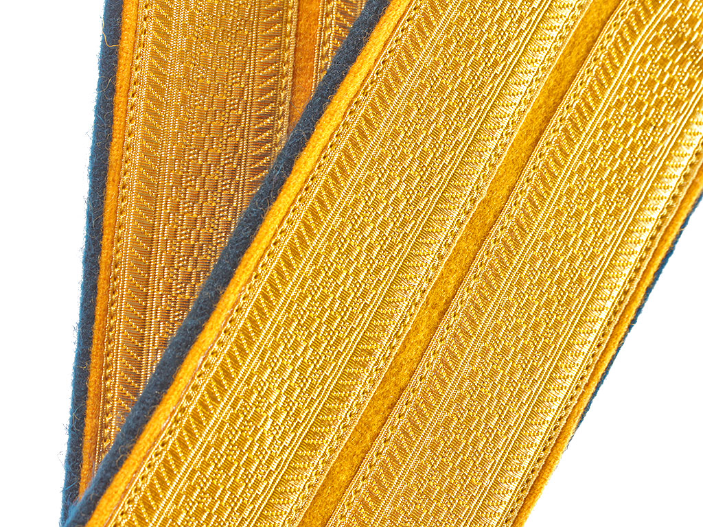 Копия высокого качества. Желтое металлизированное поле, желтый просвет, основа государев цвет, двойной кант государев и желтый.