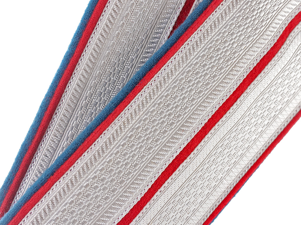 Копия высокого качества. Белое металлизированное поле, алый просвет, голубой основа, двойной кант - голубой и алый.