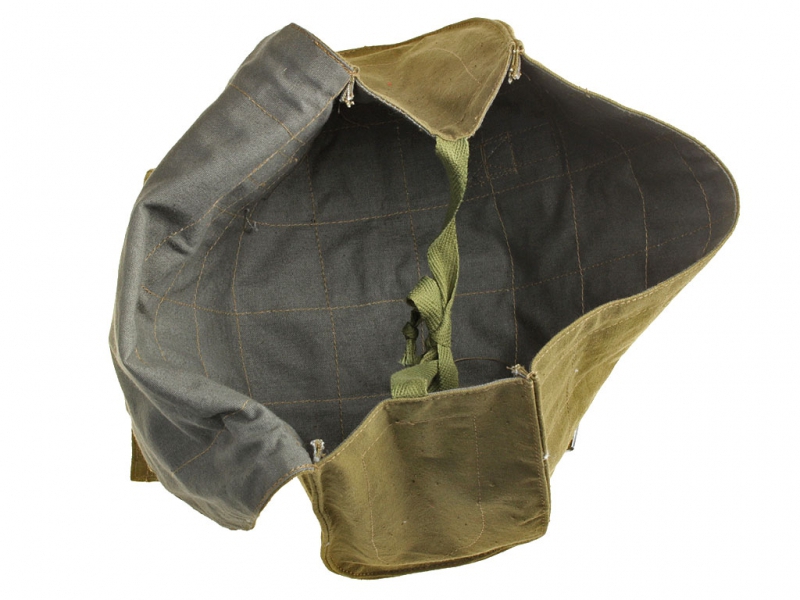 Надень сумку противогаза (с вложенной в нее защитной накидкой) плечевой тесьмой через правое плечо поверх плечевых лямок снаряжения так, чтобы сумка противогаза находилась на левом боку за гранатной сумкой; верхний край сумки противогаза должен быть на уровне с верхним краем поясного ремня и клапаном наружу.