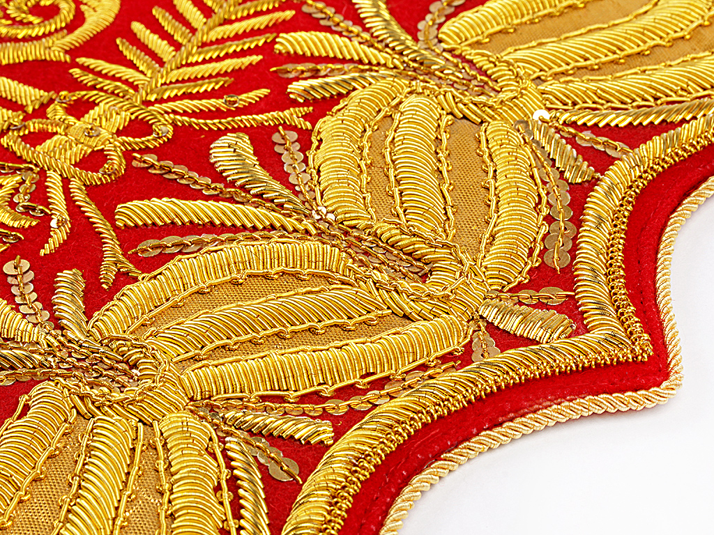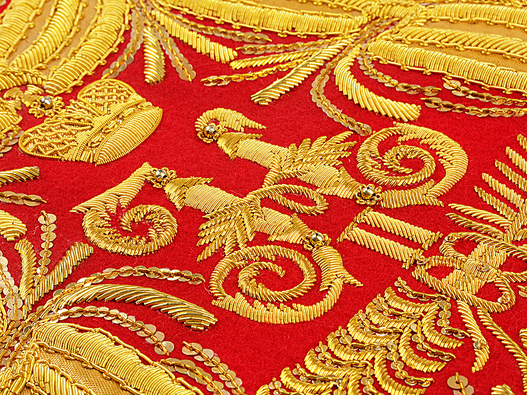 При изготовлении использована натуральная кожа, золотое шитье (9 различных видов канители), приборное сукно, шелк.