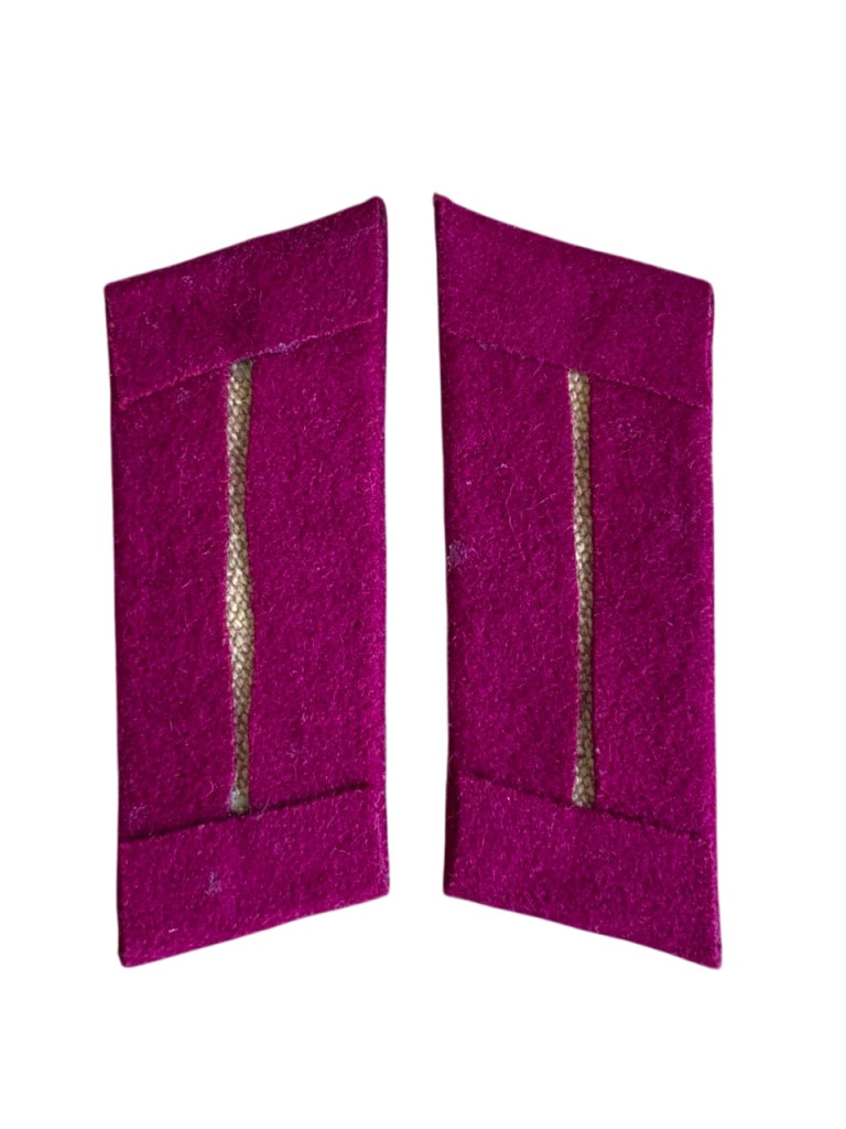 Копия парадных петлиц старшего офицерского состава интендантской и военно-юридической службы службы Красной Армии, на китель образца 1943 года. Изготовлены из приборного малинового сукна без окантовки. На петлицах серебряной тонкой канителью вышиты две полоски, перевитые зигзагообразно золотой канительной нитью. Проложены холстом. Длина петлиц в готовом виде - 7,5 см, ширина - 3 см. Данный вид петлиц был установлен Приказом НКО СССР №25 от 15 января 1943 года "О введении новых знаков различия для личного состава Красной Армии").