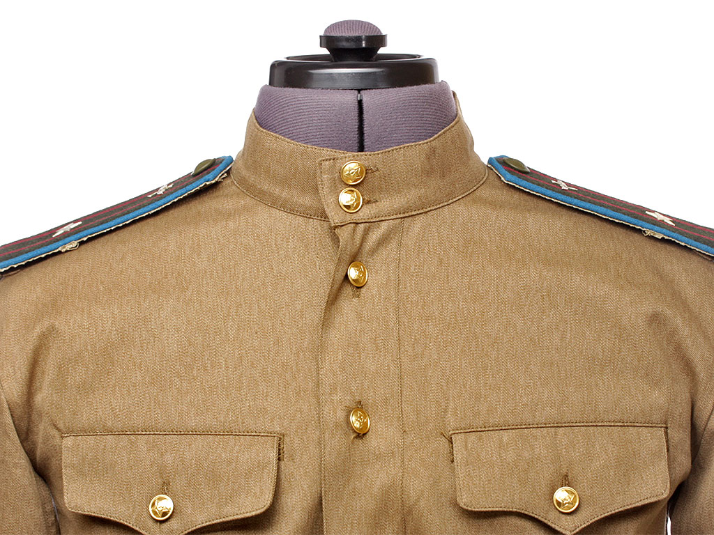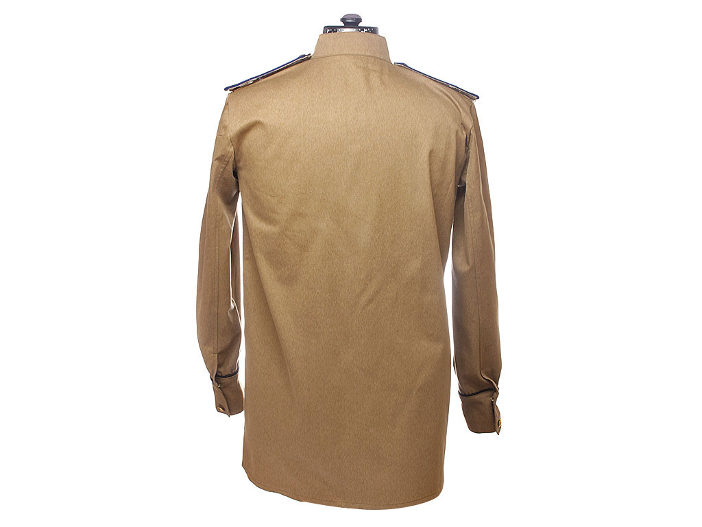 Гимнастерка (летняя рубаха) введена Приказом Народного Комиссара Обороны СССР № 25 от 15 января 1943 года. Изготовлена из хлопчатобумажной ткани защитного цвета со стоячим мягким воротником, застегивающимся на две форменные пуговицы малого размера через сквозные петли. На плечах пристегнуты погоны установленного образца. Рубаха имеет нагрудную планку с застежкой на три пуговицы и два нагрудных прорезных (встроенных) кармана с клапанами на одной пуговице (т.к. это гимнастерка начсостава - у рядового состава карманы на 1943 год отсутствуют). Рукава имеют обшлага с двумя пуговицами. Обшлага имеют цветной кант (в данном случае - голубого цвета). Такой же кант имеют и галифе.