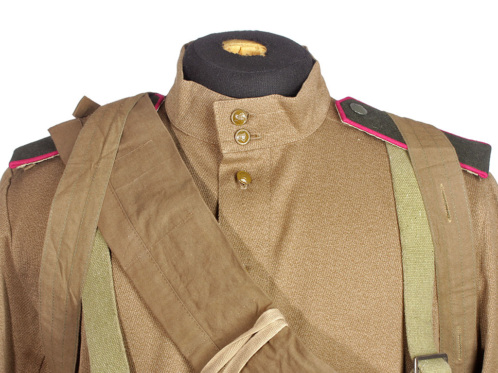 Воротники гимнастерок всех образцов взамен отложных - стоячие, мягкие застегивающиеся сквозными петлями спереди на две форменные пуговицы малого размера.