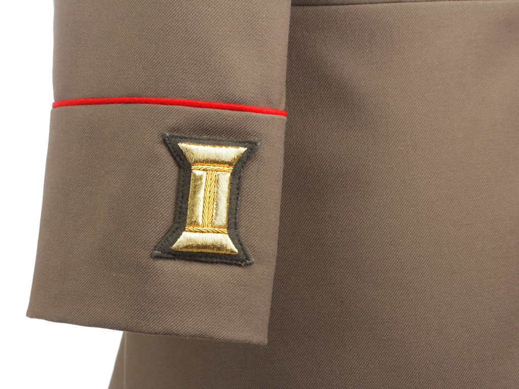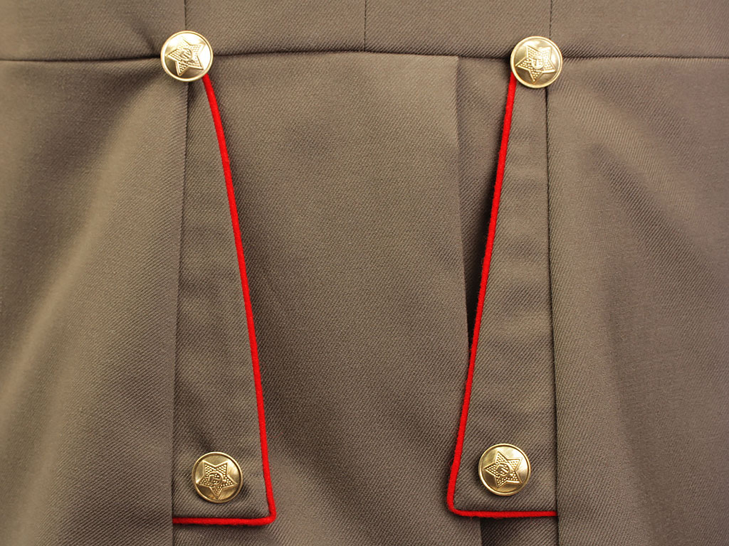 Мундир застегивается на пять латунных пуговиц с изображением пятиконечной звезды. На обшлага мундира нашиты по одной золотой катушке.