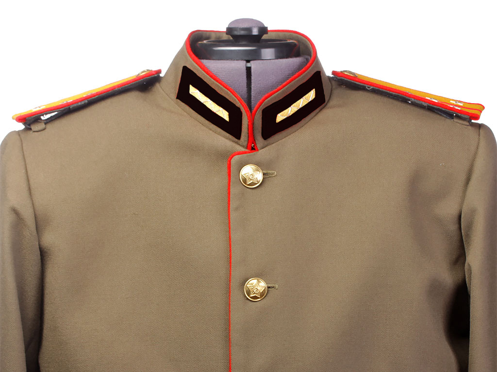 Китель однобортный, защитного цвета, с красным суконным кантом по борту, обшлагам и листочкам задних карманных клапанов. Воротник "стоечка" - жесткий стоячий с красной окантовкой, застегивается на крючки. На воротнике нашиты петлицы черного цвета без кантов с шитой золотом продольной полоской, расшитой зигзагом (строевой состав). Петлицы могут быть как из черного сукна (артиллерия), так и из черного бархата (танкисты, автобронетанковые войска).
