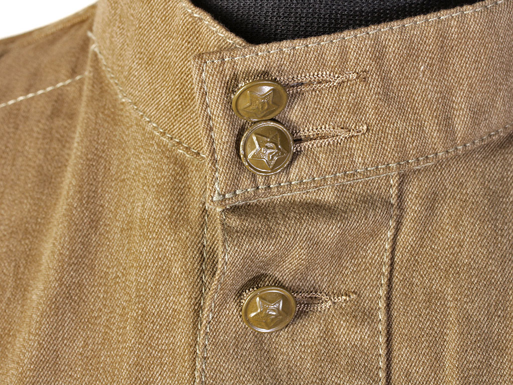 Воротники гимнастерок всех образцов взамен отложных - стоячие, мягкие застегивающиеся сквозными петлями спереди на две форменные пуговицы малого размера.