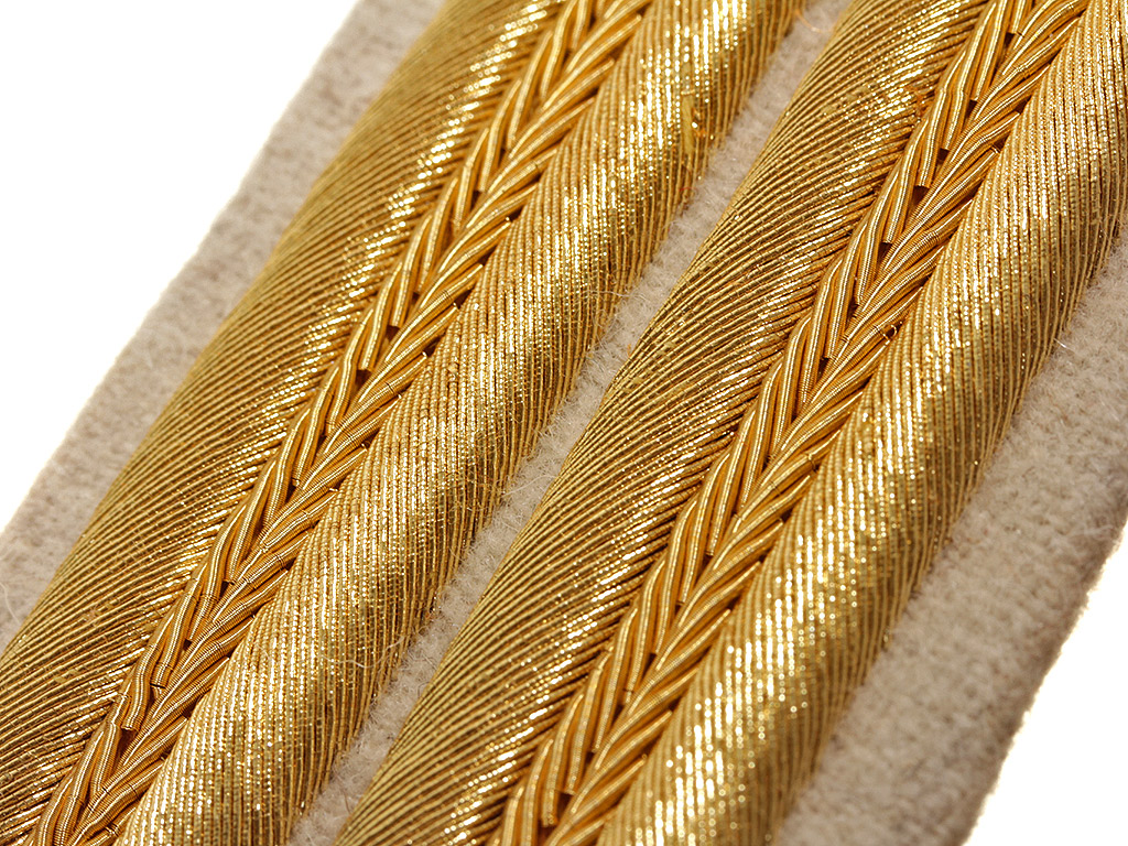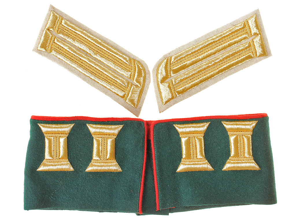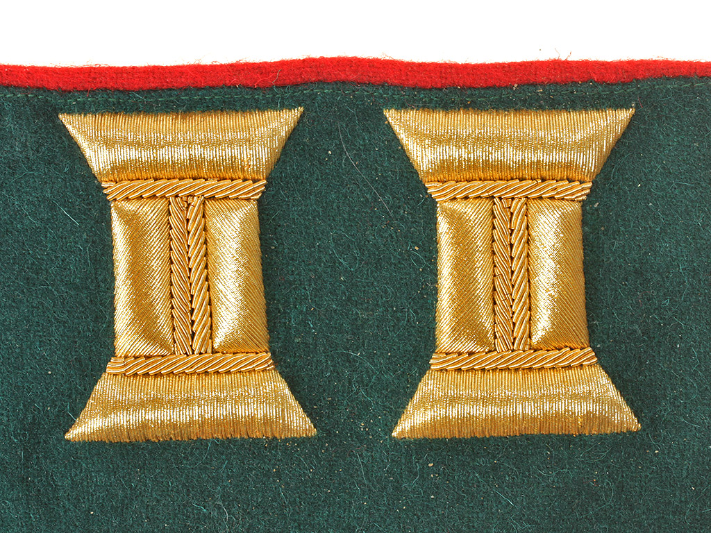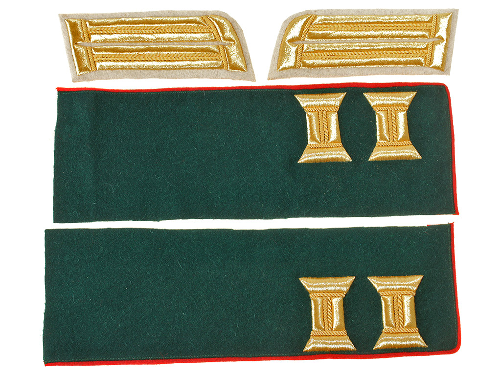 Расшитые золотом петлицы и обшлага на воротник для парадного мундира офицеров армейской пехоты образца 1909 года, такие петлицы белого цвета носили офицеры третьих полков армейской пехоты и армейских гренадер, полк в составе дивизии обозначался цветом воротника, первый полк Красный, второй-Синий, третий-Белый и четвертый цвета мундира, у офицеров зеленый, а у солдат черный.