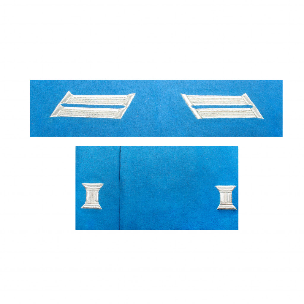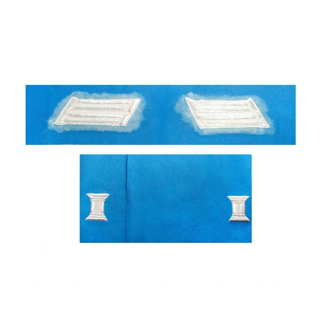 Копия шитья ворота и обшлагов офицерского мундира Отдельного корпуса жандармов выполнено серебряной канителью различной толщины по светло-голубому суконному подбою.