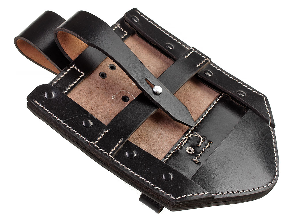 Ранние чехлы для складной лопаты (Taschefur Klappspaten) были из черной искусственной или натуральной кожи, но поздние изготавливались из светло-бронзового «пресс-ш гоффа» со сплошной задней лопастыо и внешним ободком из натуральной кожи. Лопатка накрывалась сверху крышкой и удерживалась на месте широким кожаным ремешком, пристегивавшимся к крючку на тонком поперечном ремешке. Кончик кожаного футляра лопаты оснащался металлическим протектором.