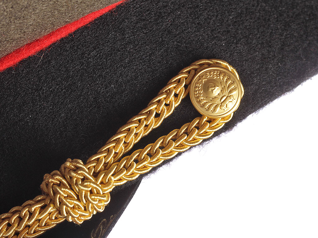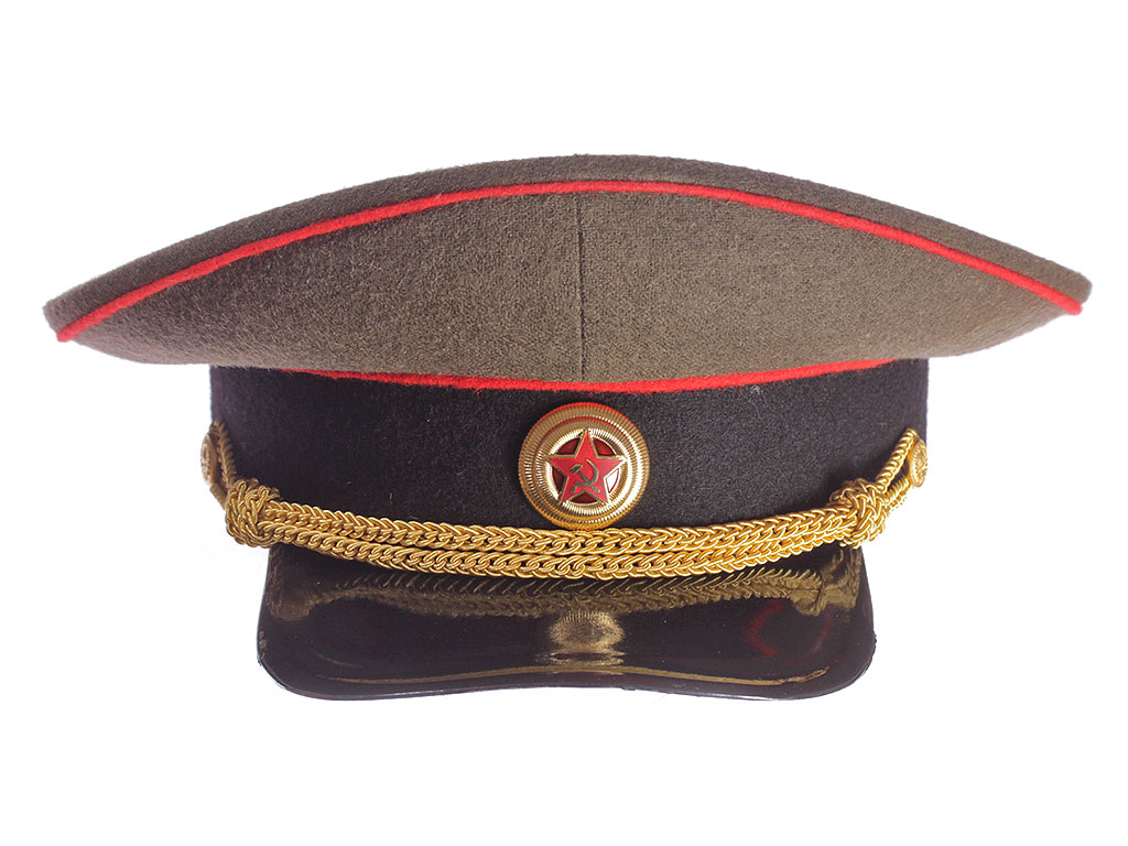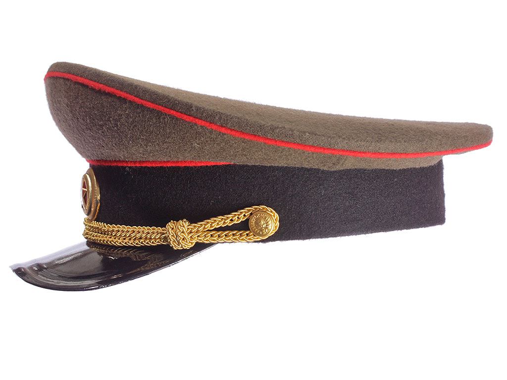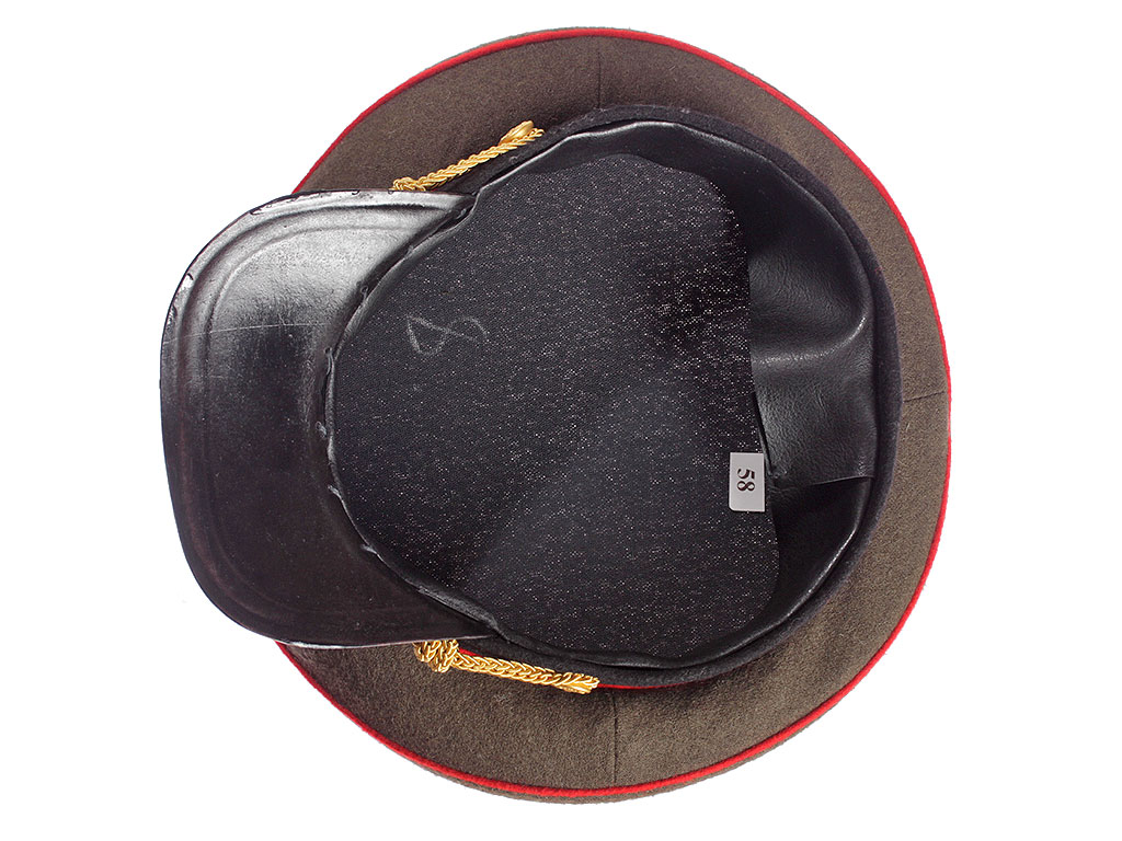 Черный суконый околыш, тулья цвета хаки, кант красного цвета.