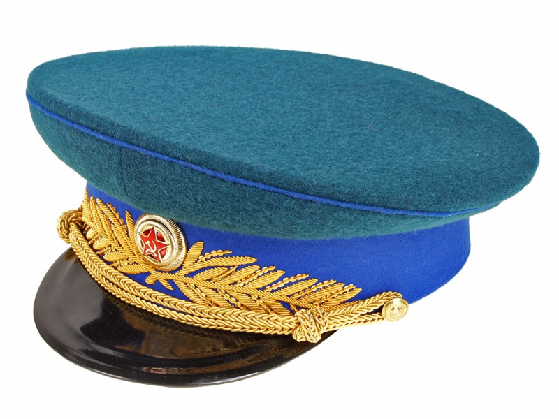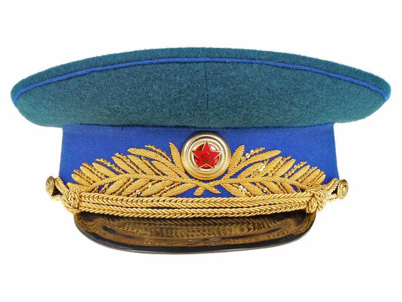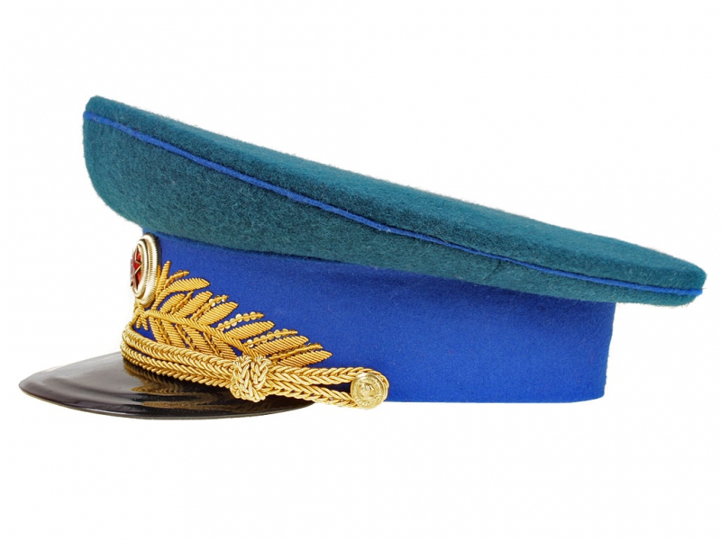 Парадная фуражка с шитьем установленного образца. Канты на тулье в цвет окантовки мундира, васильковый околыш с шитьем золотистого цвета в виде лавровых ветвей на передней части и круглой генеральской кокардой в середине существующего образца. Филигран (подбородный шнур) золотистого цвета на двух малых пуговицах. Козырек черного цвета ручной работы.