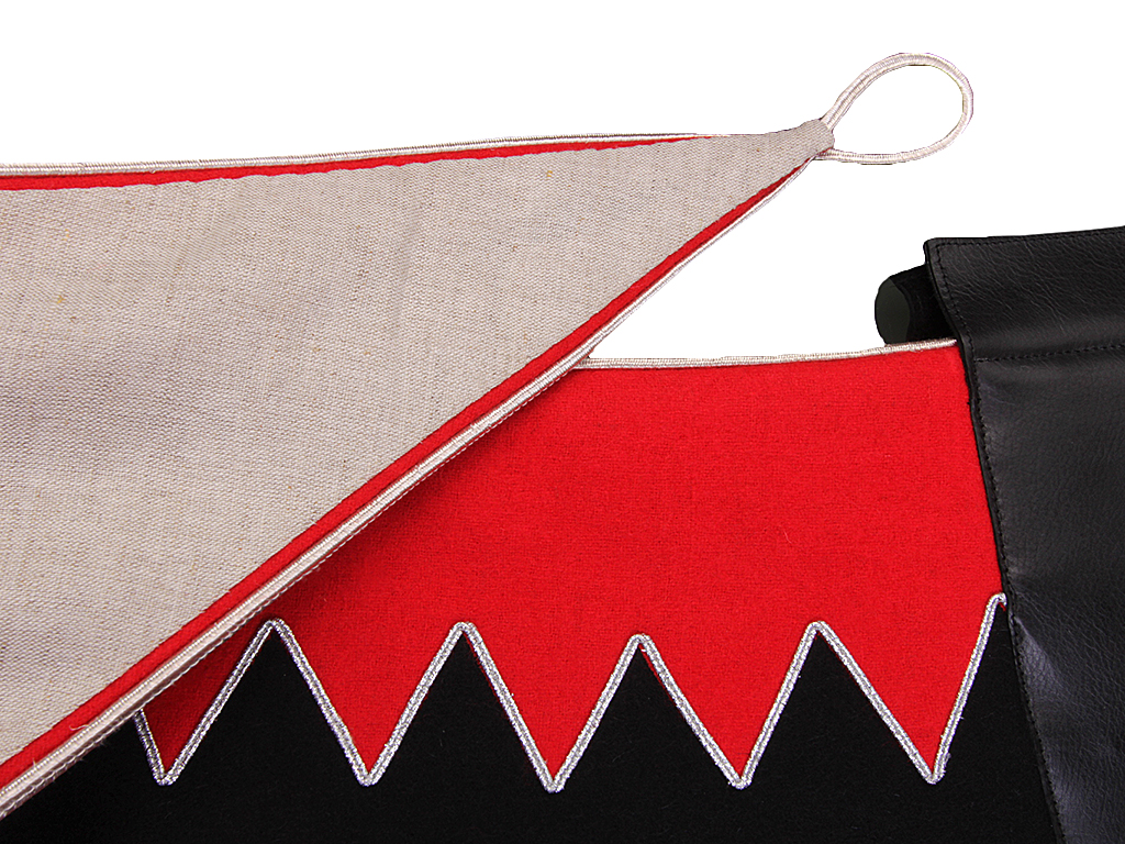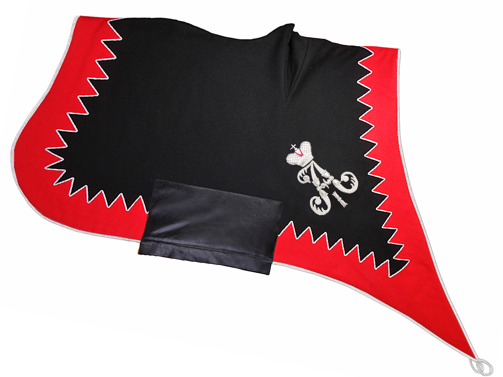Вальтрап (чепрак) для лошади офицера знаменитых "Черных гусар" - Александрийского гусарского полка периода правления Александра I. Данному полку соответствовал присвоенный им чепрак черного цвета с серебряным шитьем, сам вальтрап был обшит по краю широким зигзагообразным серебряным галуном. Учитывая общую яркость гусарской униформы, легко представить, что убор боевого коня вполне соответствовал убранству владельца, и офицеры гусарских полков не жалели на него средств. Зачастую использовались галуны и канитель из натурального серебра, подобные элементы стоили немалых денег.