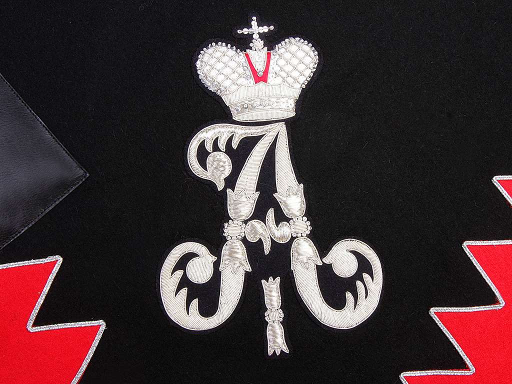 Шитый серебряной металлизированной канителью вензель Императора Александра, который нашит в задней (тыльной) части вальтрапа при изготовлении реплики выполнен различными видами канители и шелка.